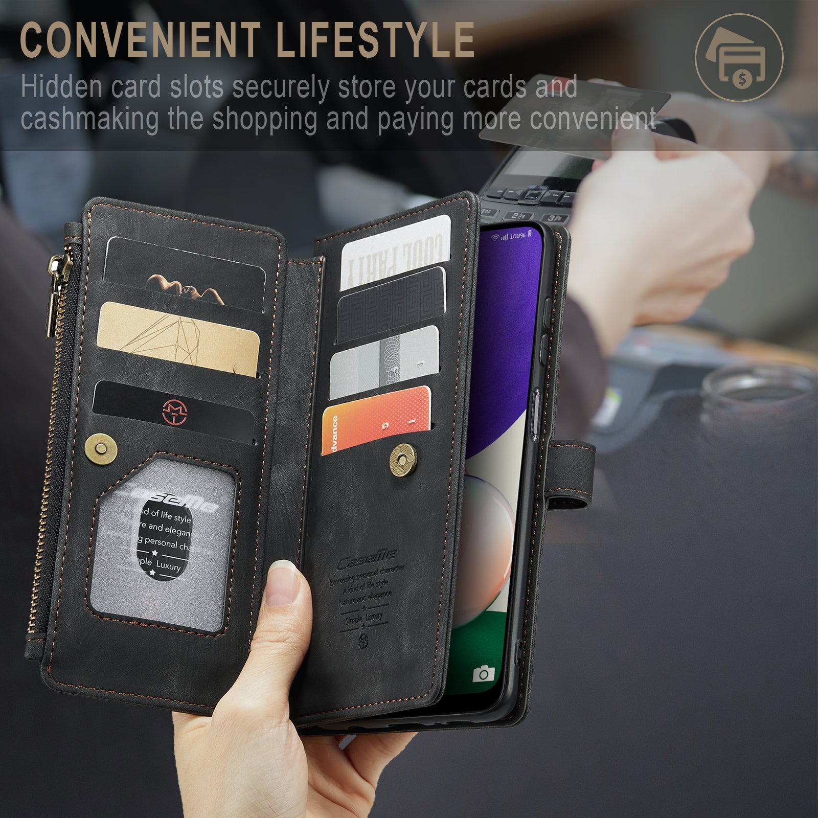 5. Hidden card slots securely streo your cards and cash making the shopping and paying more comvenient.