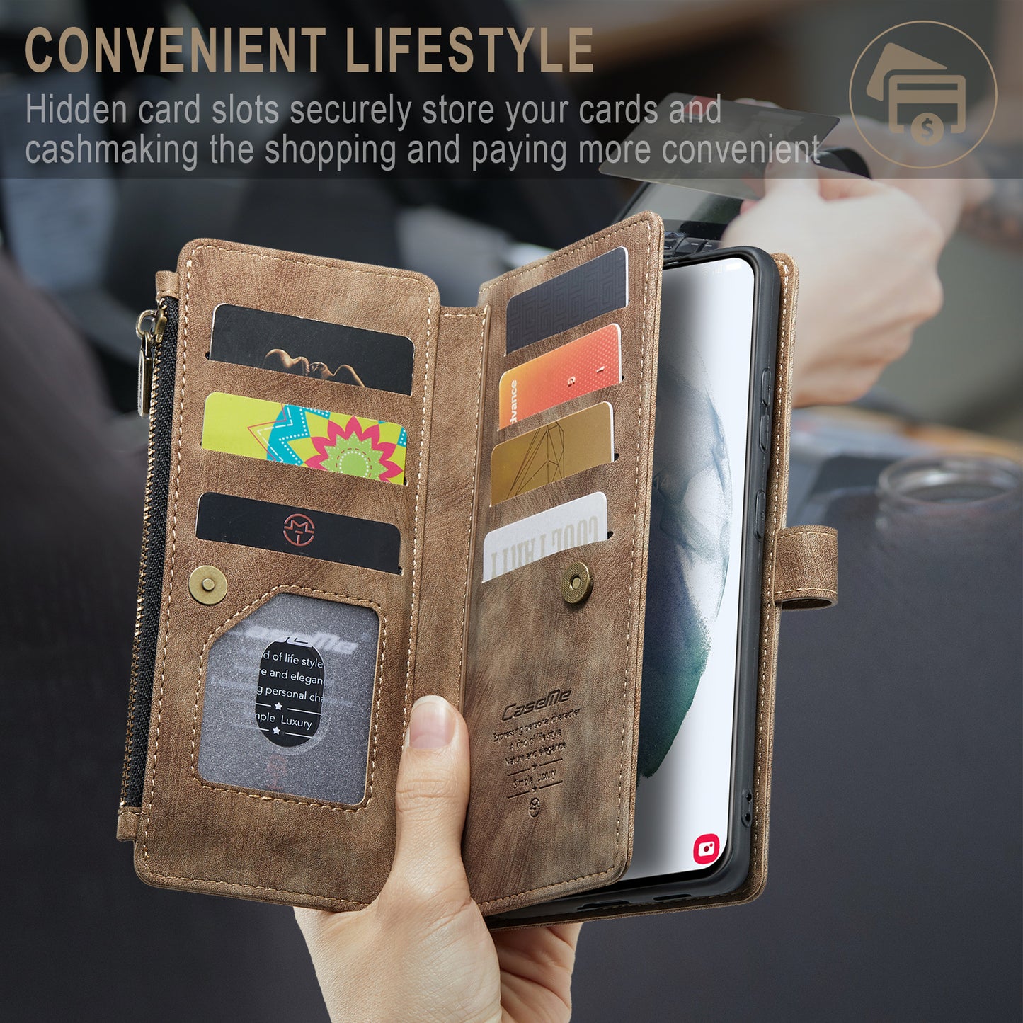 5. Hidden card slots securely streo your cards and cash making the shopping and paying more comvenient.